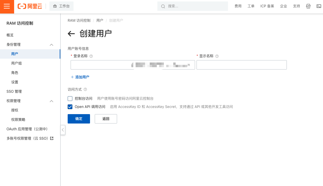 - 获得 RAM 用户 AccessKey ID 和 AccessKey Secret 保存下来